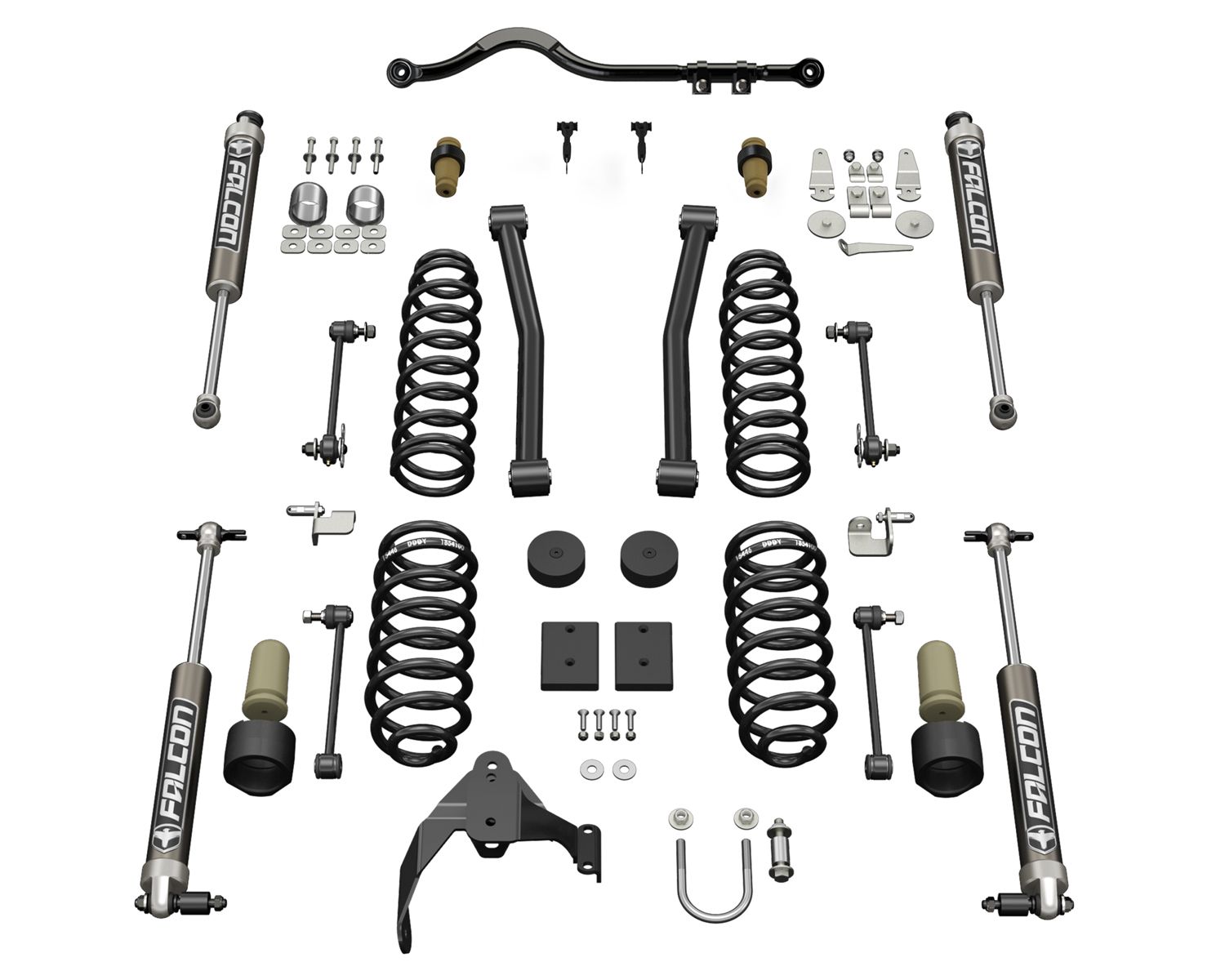 These all-inclusive TeraFlex Sport ST (Street & Trail) Suspensions Systems deliver true street & trail (ST) performance and capability in a dependable and maintenance-free package. Developed for the Jeep enthusiast looking for highway stability and trail performance in a no-compromise package the 2.5" Sport ST2 Suspension System adds preset front lower Sport Control Arms an HD Forged Adjustable Front Track Bar rear track bar bracket and more. The additional ground clearance allows for fitment of larger diameter tires with excellent on- and off-road manners. All Sport ST Suspension Systems feature lift coil springs bump stops and front sway bar quick disconnects optimized for stated lift height. Sport ST2 and Sport ST3 Suspension Systems add preset Sport Control Arms (2.5"+: front lower; 3": rear upper rear lower) to balance caster and pinion angles as well as optimize rear pinion angles anti-squat geometry and tire position. These systems also include our HD Forged Adjustable Front Track Bar and rear track bar bracket which improve steering response center the axles to optimize vehicle roll center and reduce body roll for unsurpassed handling. This results in a simple install and drive" bolt-on installation with no cutting welding or alignment required. These maintenance-free suspension systems provide superior on-road ride quality and comfort with maximum off-road flex. TeraFlex suspension systems provide reduced noise vibration and harshness (NVH). Sport ST Suspension Systems can be installed on Friday wheeled on Saturday and driven to church on Sunday! Does NOT include shocks. We recommend Falcon Performance Shocks. Falcon shock absorbers and TeraFlex lift coil springs have been engineered together to improve both compression and rebound for optimal vehicle stability. Sport ST2 Spring Lift Systems are offered with Falcon Series 2.1 Monotube Shocks or without shock absorbers.