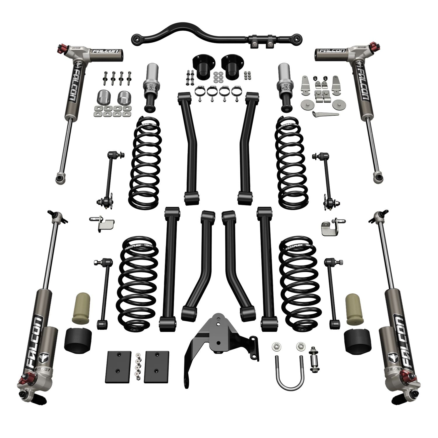 These all-inclusive TeraFlex Sport ST (Street & Trail) Suspensions Systems deliver true street & trail (ST) performance and capability in a dependable and maintenance-free package. At home on black diamond trails or city streets, the 3" Sport ST3 Suspension System features front lower rear upper and rear lower preset Sports Control Arms SpeedBump Front & Progressive Rear Bump Stops front brake line anchors and more. Although the Sport ST3 clears the same size tires as the Sport ST2 the additional components increase ground clearance without compromising on- and off-road prowess. All Sport ST Suspension Systems feature lift coil springs bump stops and front sway bar quick disconnects optimized for stated lift height. Sport ST2 and Sport ST3 Suspension Systems add preset Sports Control Arms (2.5"+: front lower; 3": rear upper rear lower) to balance caster and pinion angles and optimize rear pinion angles anti-squat geometry and tire position. These systems also include our HD Forged Adjustable Front Track Bar and rear track bar bracket which improve the steering response center of the axles to optimize vehicle roll center and reduce body roll for unsurpassed handling. This results in a simple install and drives" bolt-on installation with no cutting welding or alignment required. These maintenance-free suspension systems provide superior on-road ride quality and comfort with maximum off-road flex. TeraFlex suspension systems provide reduced noise vibration and harshness (NVH). . Falcon shock absorbers and TeraFlex lift coil springs have been engineered together to improve both compressions and rebound for optimal vehicle stability. Sport ST3 Suspension Systems are offered with select Falcon Series Shocks including 3.3 Fast Adjust 3.1 Piggyback 2.1 Monotube or without shock absorbers.
