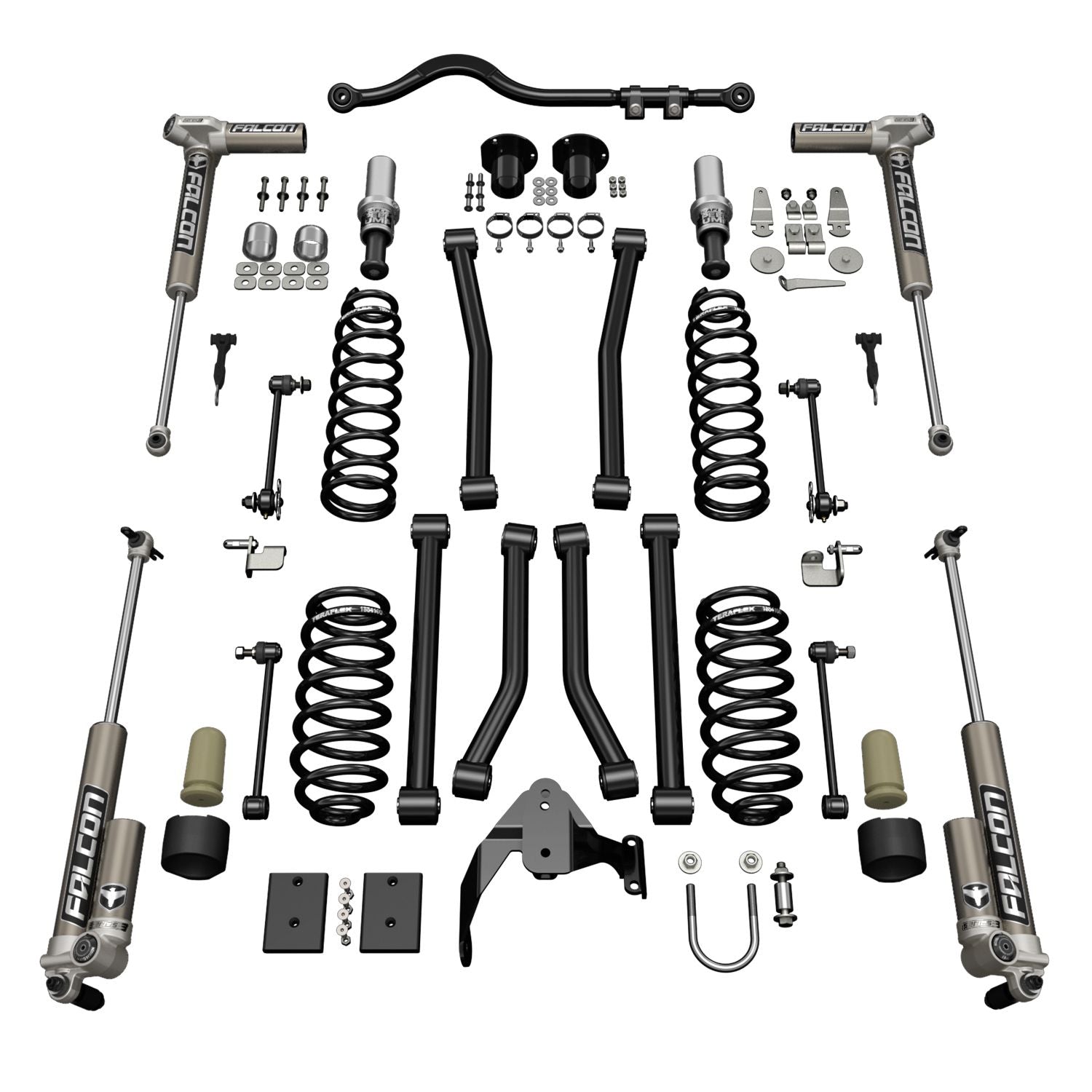 These all-inclusive TeraFlex Sport ST (Street & Trail) Suspensions Systems deliver true street & trail (ST) performance and capability in a dependable and maintenance-free package. At home on black diamond trails or city streets, the 3" Sport ST3 Suspension System features front lower rear upper and rear lower preset Sport Control Arms SpeedBump Front & Progressive Rear Bump Stops front brake line anchors and more. Although the Sport ST3 clears the same size tires as the Sport ST2 the additional components increase ground clearance without compromising on- and off-road prowess. All Sport ST Suspension Systems feature lift coil springs bump stops and front sway bar quick disconnects optimized for stated lift height. Sport ST2 and Sport ST3 Suspension Systems add preset Sport Control Arms (2.5"+: front lower; 3": rear upper rear lower) to balance caster and pinion angles as well as optimize rear pinion angles anti-squat geometry and tire position. These systems also include our HD Forged Adjustable Front Track Bar and rear track bar bracket which improve the steering response center of the axles to optimize vehicle roll center and reduce body roll for unsurpassed handling. This results in a simple install and drives bolt-on installation with no cutting or welding required. These maintenance-free suspension systems provide superior on-road ride quality and comfort with maximum off-road flex. TeraFlex suspension systems provide reduced noise vibration and harshness (NVH). Sport ST Suspension Systems can be installed on Friday wheeled on Saturday and driven to church on Sunday! We recommend Falcon Performance Shocks. Falcon shock absorbers and TeraFlex lift coil springs have been engineered together to improve both compression and rebound for optimal vehicle stability.