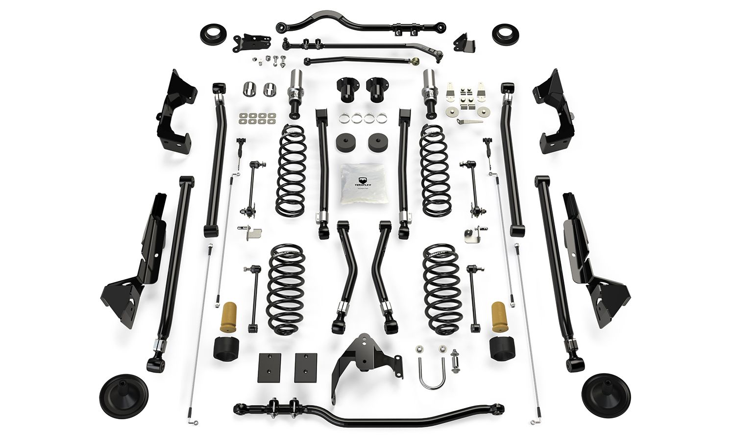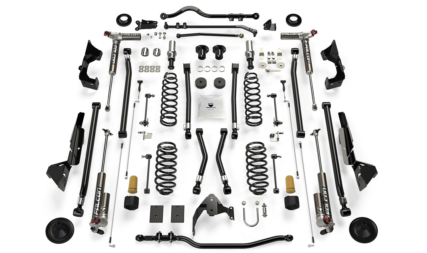 TeraFlex Alpine CT (Cross-Trail) Suspension Systems build on our Sport ST (Street & Trail) Suspension Systems. The TeraFlex 6" Alpine CT6 Long Arm Suspension System excels on the highway off-road through the desert or rock crawling! The Alpine CT6 includes our HD Drag Link Flip Kit w/ Front Track Bar Drop Bracket & Frame Brace Kit to correct steering geometry eliminates front-end shimmy and reinforce the frame. With its 6" lift coil springs and the ability to run a 38" tire with stock fender flares the Alpine CT6 can conquer the toughest trails! Our adjustable Alpine Long Control Arms balance front caster angle and pinion angles as well as optimize rear pinion angles anti-squat geometry and tire position on vehicles with 3-6" lifts. On higher lifts, Alpine Long Arm Brackets reposition frame-end control arm mounting points to restore near factory orientation to reduce bushing stress during extreme droop as well as shock load transferred through the Alpine Long Control Arms. The HD Forged Adjustable Front and Rear (4"+) Track Bars and Rear Track Bar Bracket improve the steering response center of the axles to optimize the vehicle roll center and reduce body roll for unsurpassed handling. This results in improved suspension geometry and relaxed control arm angles for superior ride quality and performance regardless of the terrain. These systems restore front and rear roll axis angles to minimize brake dive and acceleration squat. TeraFlex suspension systems provide reduced noise vibration and harshness (NVH). Alpine CT Suspension Systems are engineered for hardcore Jeeping without sacrificing weekday ride comfort! We recommend Falcon Performance Shocks. Falcon shock absorbers and TeraFlex lift coil springs have been engineered together to improve both compressions and rebounds for optimal vehicle stability.