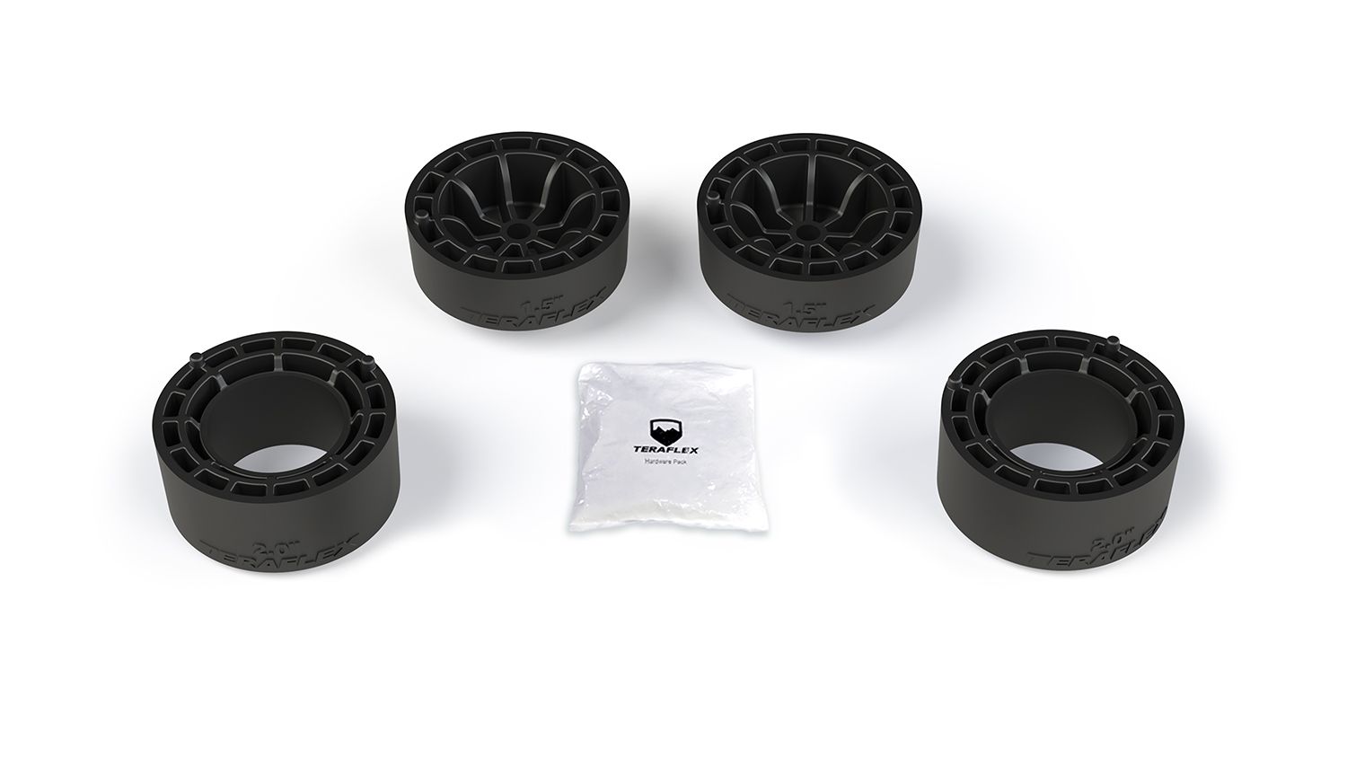 Even when reality demands that you keep your JL Wrangler Unlimited family-friendly TeraFlex will satisfy your primal need to go big. The TeraFlex JL 4dr: 1.5" Performance Spacer Lift Kit allows you to run larger tires with added clearance on the trail all while maintaining family-friendly versatility. This kit also corrects the factory rake to give your JL Wrangler Unlimited some attitude thanks to a more aggressive stance. Not only does the 1.5" Performance Spacer Lift Kit clear larger tires but the additional height helps compensate for heavier aftermarket bumpers and winch a larger spare tire or weekend gear. . Does NOT include shocks. We recommend Falcon Performance SP2 Mode Adjust Shocks or TeraFlex 9550 VSS Twin-Tube Shocks. These are the only shock absorbers engineered to work with TeraFlex lift coil spring spacers to improve both compressions and rebounds for optimal vehicle stability. 1.5" Performance Spacer Lift Kits are offered without shock absorbers. Works with stock length shock absorbers Falcon Performance Shocks and TeraFlex 9550 VSS Shocks are available separately.