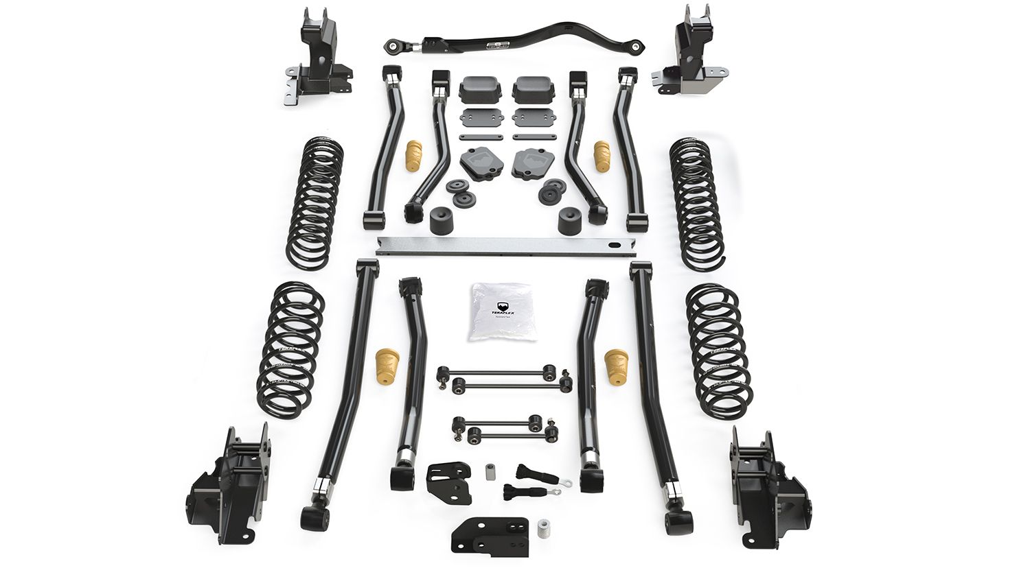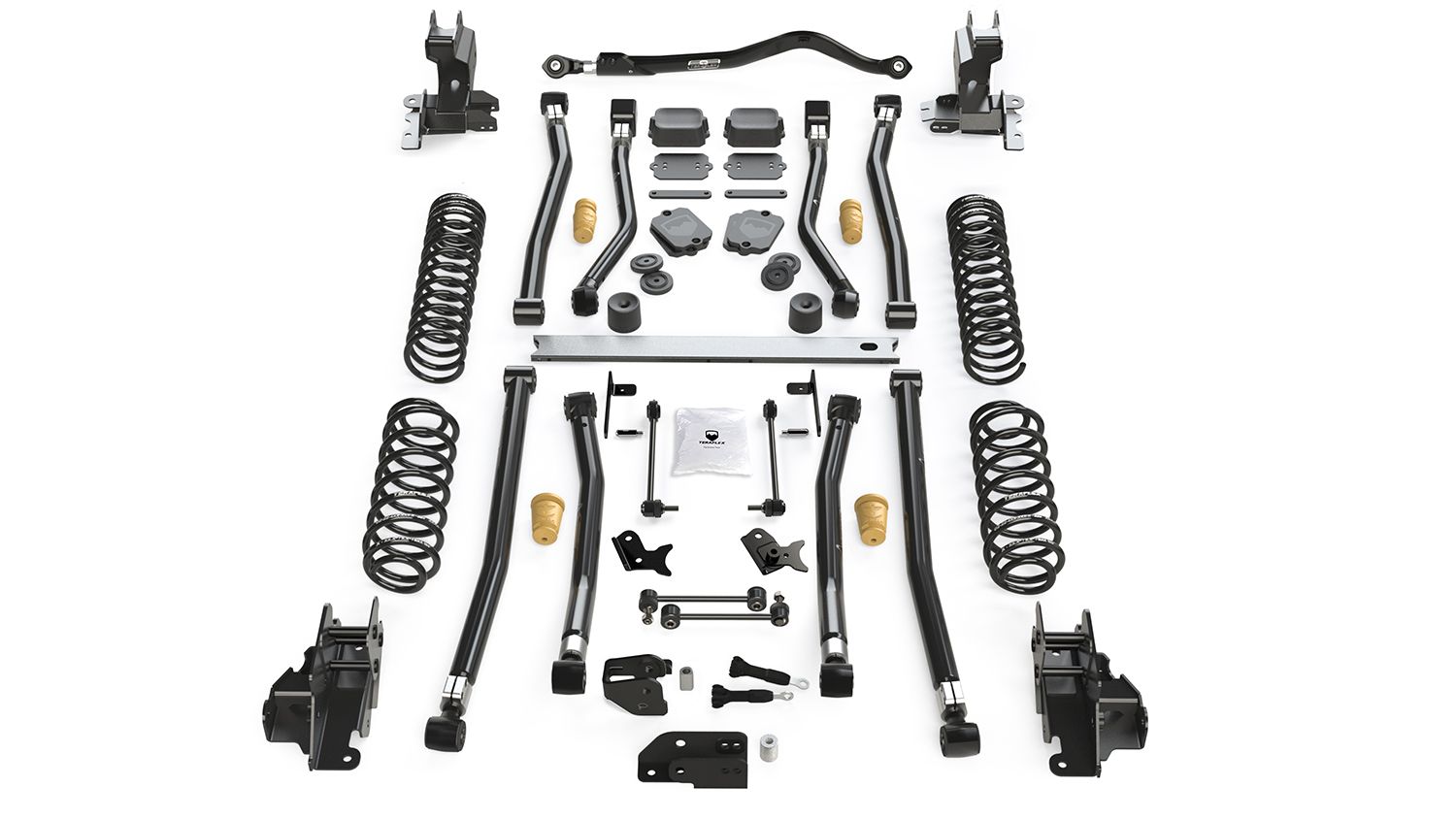 TeraFlex Alpine CT (Cross-Trail) Suspension Systems build on our Sport ST (Street & Trail) Suspension Systems. The 4.5" Alpine CT4 Long Arm Suspension System is engineered for the enthusiast who demands an off-road capable suspension with maximum adjustability flex durability and quiet performance. This all-inclusive system includes everything from the TeraFlex exclusive brake line anchor brackets to our industry-leading adjustable Alpine Long Control Arms & Brackets. The Alpine CT4 is designed to flex and droop over boulders and fly across flats like nothing you have ever experienced. And like all TeraFlex lifts, the highway manners of the CT4 are legendary. Adjustable Alpine Long Control Arms balance front caster and pinion angles as well as optimize rear pinion angles anti-squat geometry and tire position on vehicles with 3-6" lifts. On higher lifts, Alpine Long Arm Brackets reposition frame-end control arm mounting points to restore near factory orientation to reduce bushing stress during extreme droop as well as shock load transferred through the Alpine Long Control Arms. The Front HD Forged Adjustable Track Bar and Front and Rear Track Bar Axle Brackets improve the steering response center of the axles to optimize the vehicle roll center and reduce body roll for unsurpassed handling. This results in improved suspension geometry and relaxed control arm angles for superior ride quality and performance regardless of the terrain. These systems restore front and rear roll axis angles to minimize brake dive and acceleration squat. TeraFlex suspension systems provide reduced noise vibration and harshness (NVH). Alpine CT Suspension Systems are engineered for hardcore Jeeping without sacrificing weekday ride comfort! Does NOT include shocks. We recommend Falcon Performance Shocks. Falcon shock absorbers and TeraFlex lift coil springs have been engineered together to improve both compressions and rebounds for optimal vehicle stability. Sold separately.