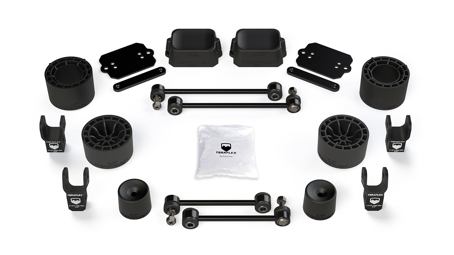 The TeraFlex JL 4dr Rubicon: 2.5" Performance Spacer Lift Kit w/ Shock Extensions is the most economical way to fit larger tires and increase ground clearance on your JL Wrangler Unlimited Rubicon with the least amount of modifications. We recommend Falcon Performance SP2 Mode Adjust Shocks or TeraFlex 9550 VSS Twin-Tube Shocks. These are the only shock absorbers engineered to work with TeraFlex lift coil spring spacers to improve both compression and rebound for optimal vehicle stability. 2.5" Performance Spacer Lift Kits are offered with TeraFlex 9550 VSS Twin-Tube Shocks with shock extensions or without shock absorbers or extensions. Falcon Performance Shocks are available separately.