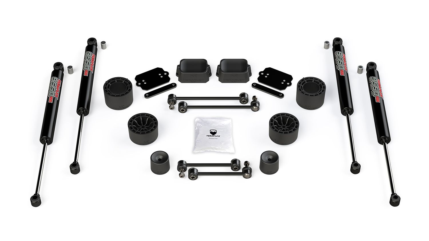 The TeraFlex JL 4dr Rubicon: 2.5” Performance Spacer Lift Kit is the most economical way to fit larger tires and increase ground clearance on your JL Wrangler Unlimited Rubicon with the fewest modifications. Also fits EcoDiesel models. We recommend Falcon Performance Shocks or TeraFlex 9550 VSS Twin-Tube Shocks. These are the only shock absorbers engineered to work with TeraFlex lift coil spring spacers to improve compression and rebound for optimal vehicle stability. The 2.5” Performance Spacer Lift Kit is offered with TeraFlex 9550 VSS Twin-Tube Shocks, with shock extensions, or without shock absorbers or extensions. Falcon Performance Shocks are available separately.