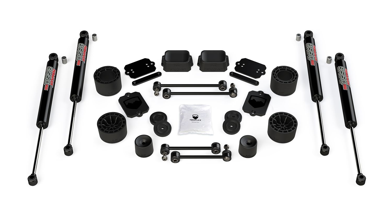 • Requires longer shocks or Shock Extensions (# 1985200) (NOT INCLUDED in base kit) – Falcon Performance Shocks or TeraFlex 9550 VSS Twin Tube Shocks (# 1545250) (available separately) recommended.