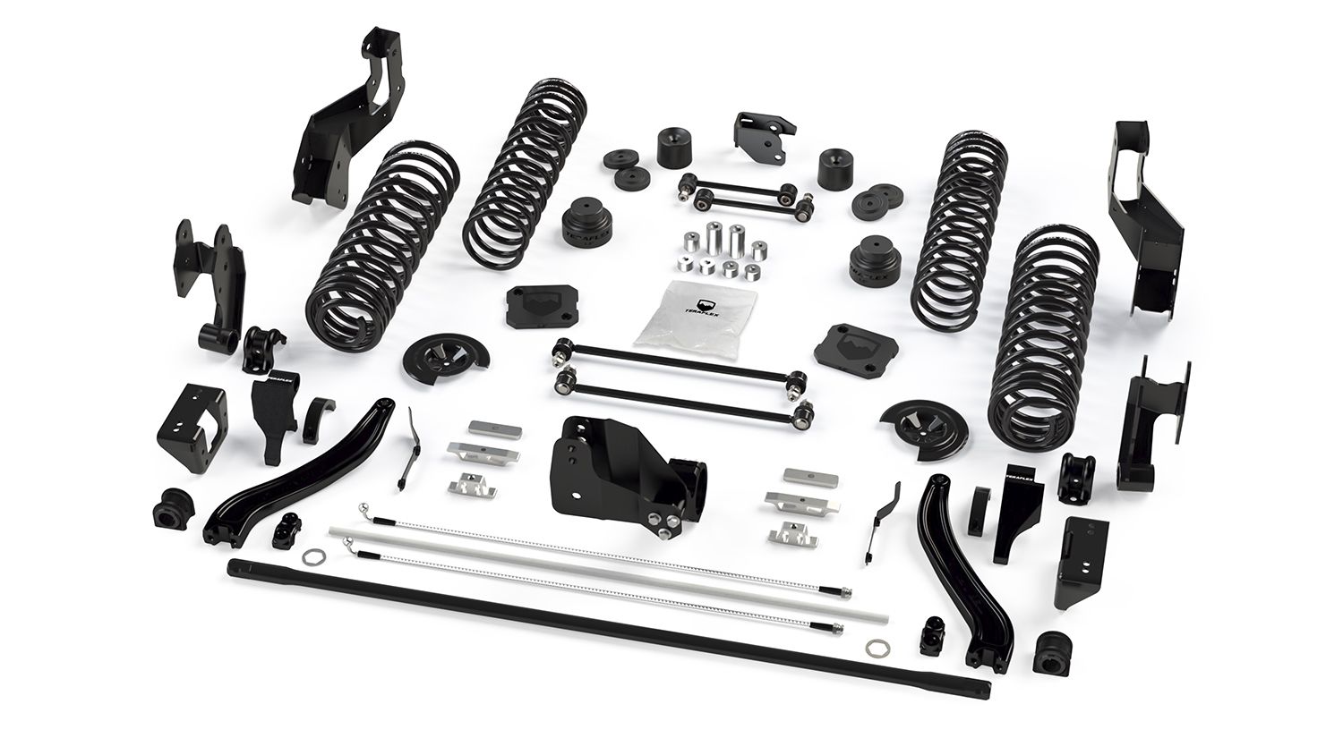 These all-inclusive TeraFlex Sport ST (Street & Trail) Suspensions Systems deliver true street & trail (ST) performance and capability in a dependable and maintenance-free package. The 3.5” Sport ST3 Extended-Travel Suspension System’s Front Control Arm Sport Frame Brackets provide a smooth ride and competent handling, while the Rear Upper Control Arm Extended-Travel Axle Brackets, Rear Driveline Lowering Spacers, Rear Forged ST Sway Bar, and Extended-Travel Shock Accessory Kit safely provide 16” of rear suspension travel. The Front and Rear Track Bar Axle Brackets correct axle position to provide a more positive steering feel. Front Control Arm Sport Frame Brackets balance the front caster angle and pinion angle to improve front suspension geometry on vehicles with 2.5–4.5” lifts. The Front and Rear Track Bar Axle Brackets improve steering response, center the axles to optimize vehicle roll center, and reduce body roll for unsurpassed handling. Extended-Travel Suspension Systems include carefully selected extended-travel components to safely provide 16” of rear suspension travel. This results in a simple “install and drives” bolt-on installation with no cutting or welding required. These maintenance-free suspension systems provide superior on-road ride quality and comfort with maximum off-road flex. TeraFlex suspension systems provide reduced noise, vibration, and harshness (NVH). Sport ST Suspension Systems can be installed on Friday, wheeled on Saturday, and driven to church on Sunday! Does NOT include shocks. We recommend Falcon Performance Shocks. Falcon shock absorbers and TeraFlex lift coil springs have been engineered together to improve both compressions and rebounds for optimal vehicle stability. Falcon shock absorbers and steering stabilizers are available separately.